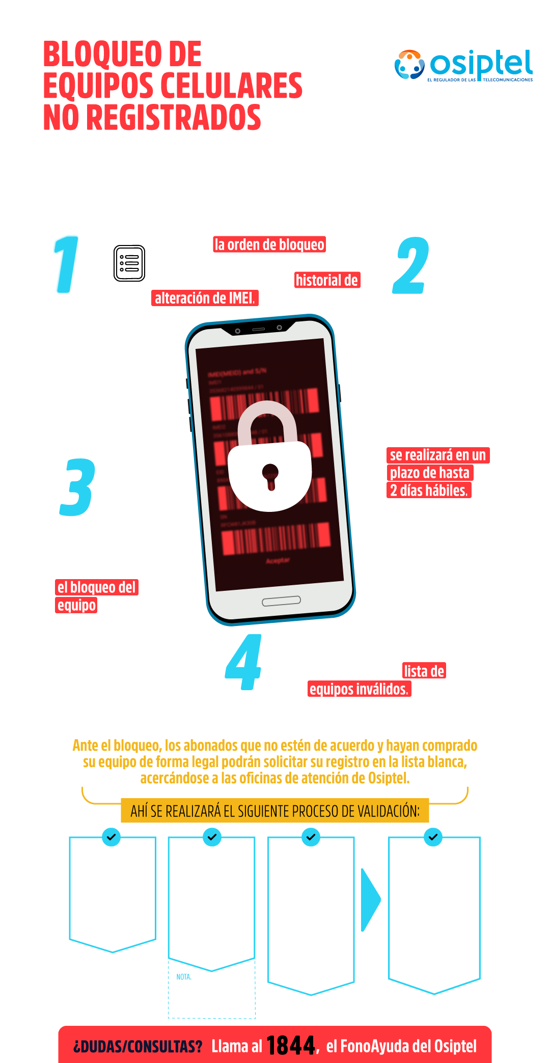 Esta medida se suma al bloqueo inmediato, en todas las redes de las empresas operadoras, de los celulares reportados como robados para imposibilitar que estos puedan seguir funcionando; así como el bloqueo, en un plazo máximo a los 2 días hábiles, de los celulares detectados con IMEI alterado (inválido, clonado o duplicado).